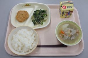 <献立名> ・ご飯 ・牛乳 ・がんものふくめ煮 ・胡麻味噌和え ・こんこん汁