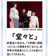 本日、2学期の最終日を迎えました。 振り返れば、8月の暑い時期から始まり、深まりゆく秋、そして寒さの厳しい今日まで、子供たちは一生懸命に学習や運動に取り組み、たくさんの思い出を作ることができました。それも、毎日の学校生活において、保護者や地域の皆様から温かい支援をいただいたこと、また、子供たちの安全を優しく見守ってくださったことのおかげだと感謝しております。冬休みは、家族や地域での行事も多い時期かと思います。健康と安全に気をつけながら、この時期ならではの体験をたくさんしてほしいと願っています。どうぞ健康に留意され、穏やかな新年をお迎えください。本当にありがとうございました。今後とも、どうぞよろしく願いします。