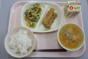 <献立名> ・ご飯 ・牛乳 ・ちくわの磯辺揚げ ・ひじきサラダ ・ピリ辛肉じゃが