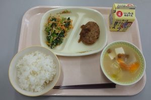 <献立名> ・ご飯 ・牛乳 ・和風ハンバーグ ・アーモンド和え ・なめこ汁
