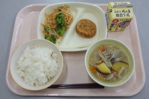 <献立名> ・ご飯 ・牛乳 ・がんもの含め煮 ・アーモンド和え ・豚汁