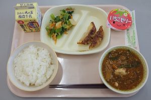 <献立名> ・ご飯 ・牛乳 ・いちごゼリー ・餃子 ・かんぴょうのナムル ・麻婆豆腐