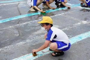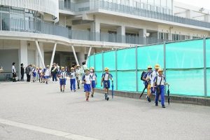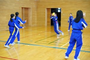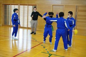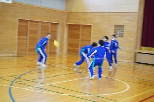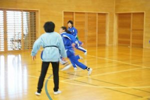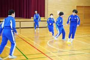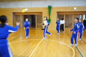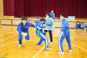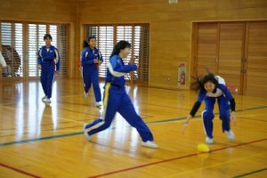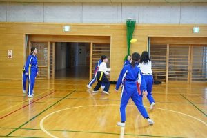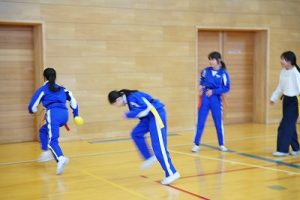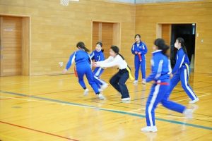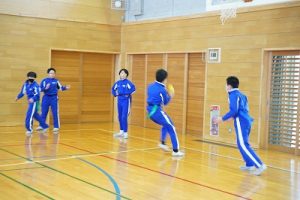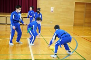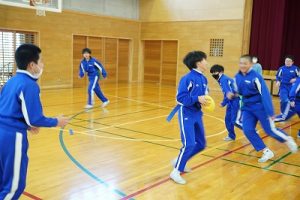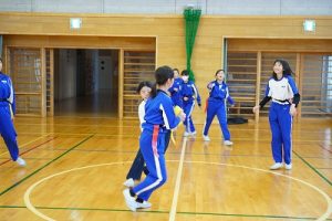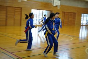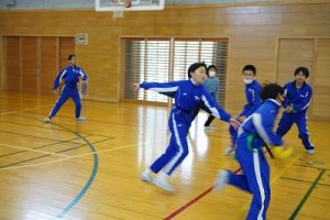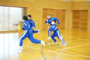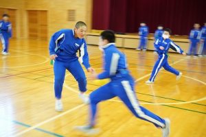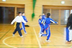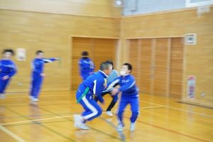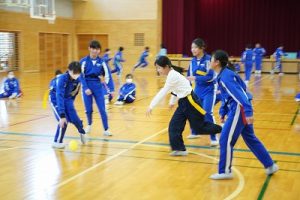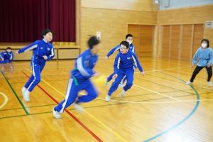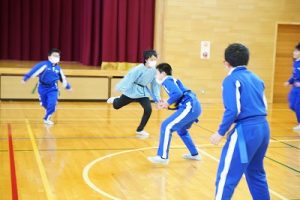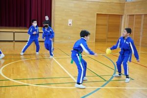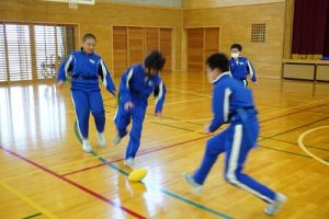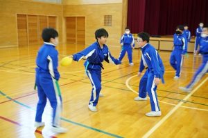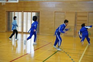 6年生の体育科では、タグラグビーを行っていました。タグラグビーは、ボールを持って走り、味方にパスし、相手ゴールを目指すスポーツです。動きが速すぎです。
