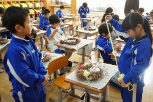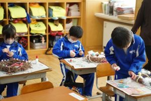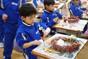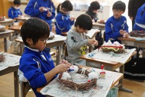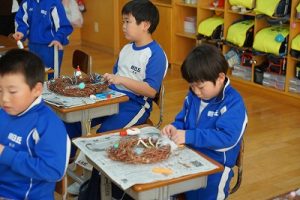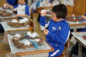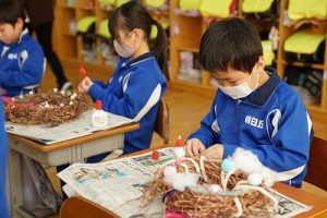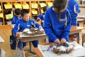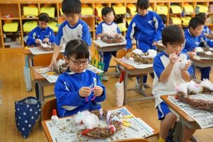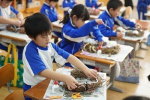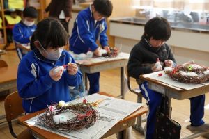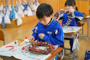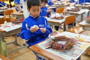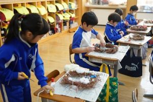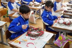 1年生は、アサガオのつるを使って、リース作りをしていました。円形のリースのは永遠に繋がっていくものとして、縁起のよいものですね。きれいな飾りになりますね。