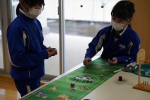 1年生の算数科では、「9+6」を体験していました。9人と6人が合体して10人を作り、残った人の人数が1の位の数字となるというわけです。体験しながら学習していて面白いですね。