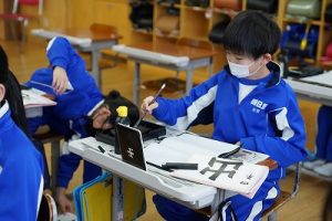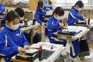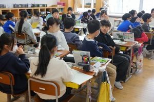 3校時の様子です。2年生は、版画の下地としてマーブリングをしていました。全員同時にはできませんので、書写ノートを書きながら順番を待ちました。待っている態度が素晴らしかったです。