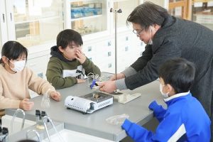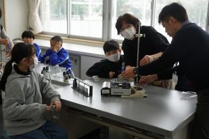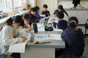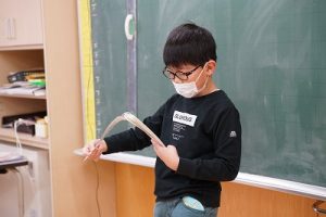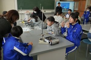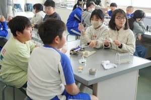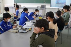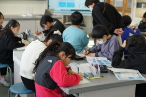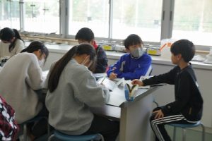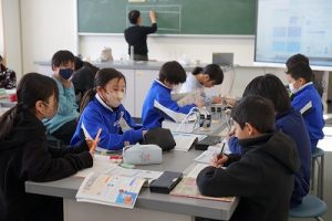 5年生の理科では、「ものを水にとかす前と、とかした後の全体の重さ」を調べる実験をしていました。写真は、実験後にまとめをしているところです。よく考えて発言していました。