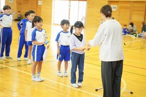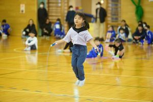 11月10日、児童クラブ主催のなわとび大会が開催され、1~3年生が参加しました。1年生と2年生は予選で1分間前跳びを行いましたが、2年生は参加者全員が予選を突破する激戦でした。どの学年も楽しそうに、そして一生懸命跳んでいました。