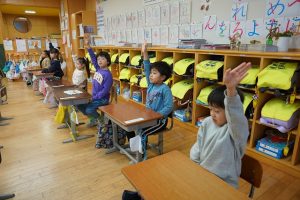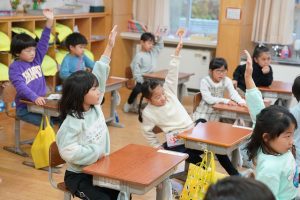1校時の1年生の様子です。発表するときの手の挙げ方がとてもきれいです。天井を突き刺すようですね。発表の仕方もとても上手です。素晴らしいですね。