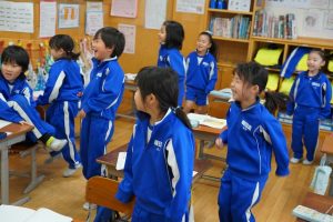 1年生の国語科は、「たぬきの糸車」という物語文を学習しています。「ぴょこんとそとにとびおりた」「おどりながらかえっていった」というところを読みながら、たぬきの気持ちになって動作化してみました。たぬきの「嬉しくてたまらない気持ち」が理解できました。
