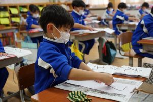 1年生と3年生の書初練習の様子です。1年生は、「えがお」と書きますが、笑顔ではく真剣な表情で書いているのがいいですね。3年生は、毛筆で「つよい心」と書きます。前回は、用具の出し入れだけを練習しましたが、今日は初めてだるま筆で書いてみました。3年生の静寂な雰囲気がとても素晴らしいと思いました。