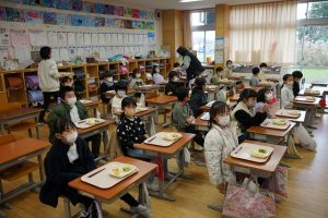 給食準備の様子です。通常は、子供たちの給食当番が配膳を行いますが、ここでも感染の拡大を防ぐ意味で、1~3年生は大人だけで配膳を行いました。教員、学習サポーター、スタディメイトの方々が協力して配膳を行い、子供たちは静かに座って待っていました。どんなに気を付けても感染するときはしますが、そのリスクを最小限にしたいと思います。ご家庭でも、どうぞお気を付けください。