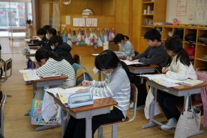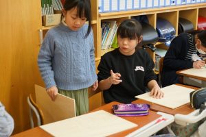 4年生と5年生は、木版画に取り組んでいます。4年生は魚や動物を、5年生は世界遺産を題材にしています。下描きが終わった人は、彫刻刀で削り始めました。けがをしないように気を付けて、集中して削る姿が見られました。