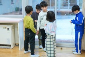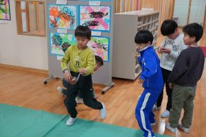 外国語活動の時間には、ゲームをとおして英語に親しむ活動をたくさん行っています。今日は、フルーツが書かれたカードを使ったゲームを楽しんでいました。決められた英語のフレーズをたくさん使って活動できるといいですね。