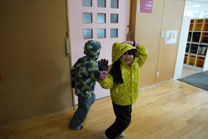 楽しみな休み時間。体育館やSTEAMミュージアムが賑わっていました。雪遊びをする子供もいました。4年生は、サンサンルームで椅子取りゲームのような遊びをしていました。楽しそうな様子を見られて嬉しく思いました。