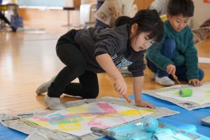 3学期の図画工作科では、版画を行います。今日は、1年生が、ローラーを使ってカラフルな模様を描いていました。どんな作品になるのか楽しみです。