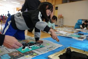 先週の金曜日に、1・2年生の版画製作の様子を掲載しましたが、今日はその続きです。1年生は、印刷が着々と進んでいます。2年生は、人の形の製作がかなり進んでいました。