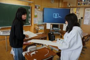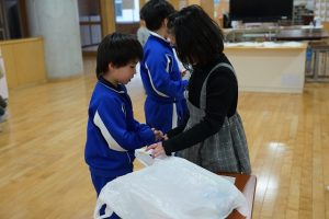 昨日、1年生の版画作品が完成したことをお伝えしましたが、今朝の朝活動で、その版画を台紙に貼りました。そして台紙にタイトルを貼り付けて、これで本当に完成です。協力し合って作業を進められました。