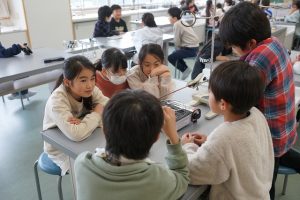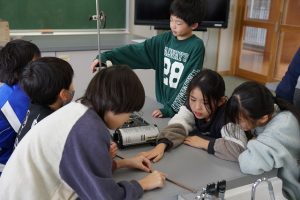 4年生の理科では、「もののあたたまり方」の学習を行っています。今日は、金属の温まり方について実験していました。金属棒と金属板にロウを塗り、カセットコンロの炎で熱し、ロウの溶け方を観察するというものです。楽しく集中することができましたね。