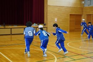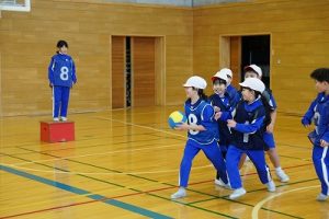 3年生の体育科では、ポートボールの学習を行っています。チームごとに練習した後、ハーフコートでのゲームを行いました。コートには3人ずつ交代で入りますが、見ている人の声がけがとてもよかったです。