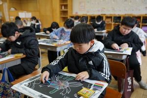 3年生の図画工作科では、先日刷り上がった白黒の版画に、「コンテパステル」を使って色付けをしていました。普通のクレパスと違って、「チョーク」のようなクレパスでした。黒いインクの上にも、黒板に描くように色を付けることができます。手で塗ったり、ティッシュでぼかしたりという工夫も見られました。作品が鮮やかになりました。