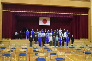 今日の卒業式の予行に向けて、昨日、紅白幕を張ったり、卒業生を写すカメラやモニターを準備したりしました。ハード面の準備も完了です。写真は、予行直前の練習風景です。
