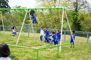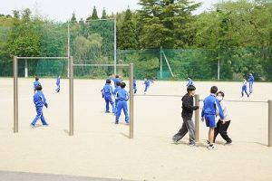 昼休みのグラウンドです。サッカーや鉄棒など、元気に遊んでいますね。