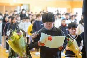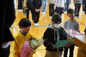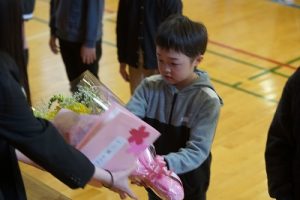 8時40分から離任式が行われました。お世話になった7名の先生方とのお別れの式です。児童の代表は手紙や花束を渡し、「これまでありがとうございました」という感謝の気持ちを、そして「新しい学校で頑張って下さい」という激励の気持ちを伝えることができました。離任された先生方に、改めてお礼を申し上げます。本当にありがとうございました。