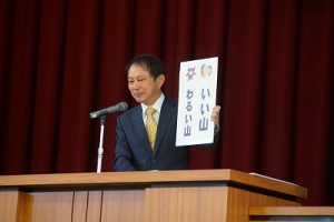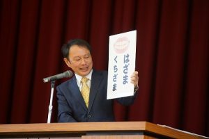 令和7年度1学期の始業式の様子です。学校生活をこれまで以上に楽しくするために頑張ってほしいことを話しました。最後に、「焼き肉のタレ」を取り出しました。焼き肉のタレは、りんご、もも、梅、醤油、砂糖、食塩、蜂蜜、リンゴ酢、ごま、たまねぎ等、たくさんのものが混ぜ合わせてあるから美味しいのです。人間も同じで、いろいろな違う人が一緒に力を合わせるから楽しくなるのです。今年度、みんなで楽しい学校をつくっていきましょう。