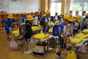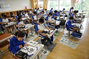 6校時の様子です。1・2年生はちょうど下校するところでした。6年生は連合体育大会の後ですが、書写(毛筆)に取り組んでいました。