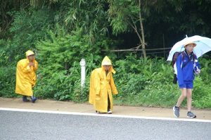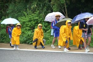 登校の様子です。今日の写真は、一つのテーマをもって撮影しました。それは、「黄色い雨合羽」です。雨の日に、上級生に見守られながら、カッパを着て登校してくる風景、本当に美しいと思います。