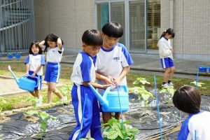 2年生が植えた野菜の苗が大きく育ってきました。みんなで、水やりをしたり観察をしたりして成長を見守っています。
