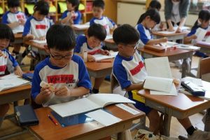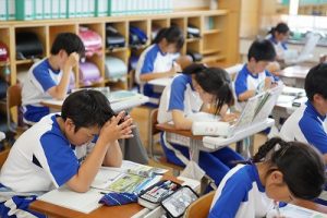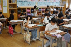 集団登校の最後の班が到着したのがちょうど8時ごろでした。その後、教室に行ってみますと、2年生は野菜を、3年生はキャベツについたアオムシを観察していました。5・6年生の集団登校の班長は、1週間の振り返りを担当の先生に見てもらっていました。