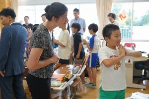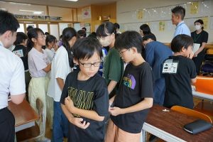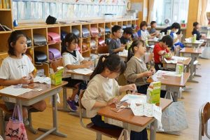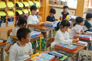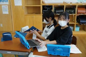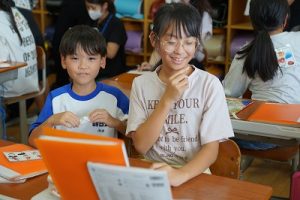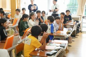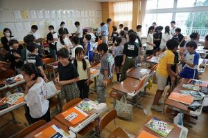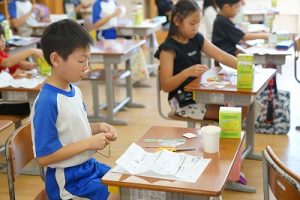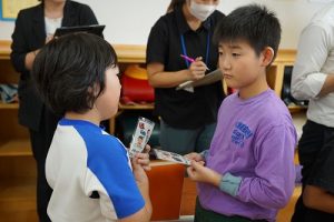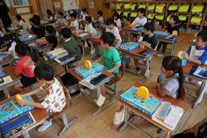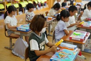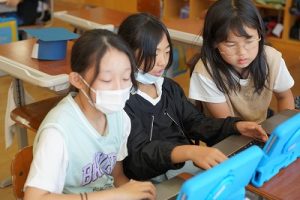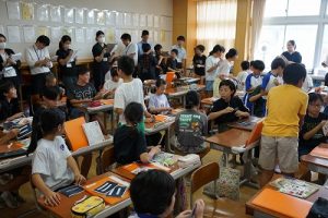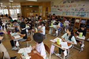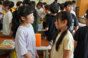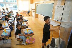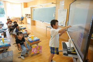 1年生の算数科では、時計の読み方を練習していました。算数セットの時計で時刻を表したり、電子黒板で説明したりしていました。しっかり学習できていますね。