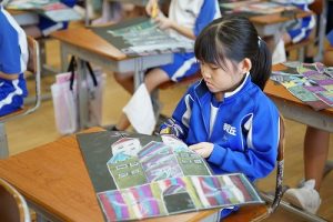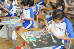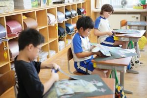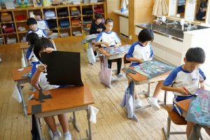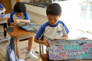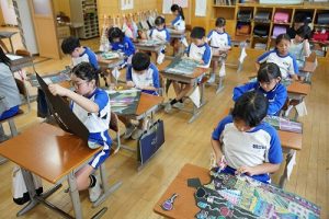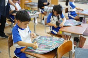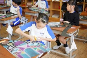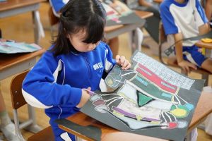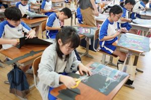 3年生の図画工作科では、描き上がった「お城」を切り取り、色画用紙に貼る作業に入りました。ただの「お城」が、「空飛ぶお城」に変わりつつあります。学習発表会での展示が楽しみです。
