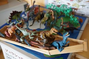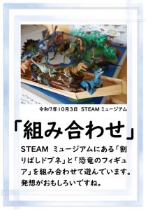 朝、STEAMミュージアムに行くと、展示物が散乱したり、何かが壊れていたりということがよくあります。でも、これは当然のことだと思っています。壊れるまで遊ぶってすばらしいことです。今朝は、「割りばしドブネ」に恐竜が乗っていました。ノアの箱舟みたいですね。このように、展示物を組み合わせて遊ぶことも、すばらしいですね。