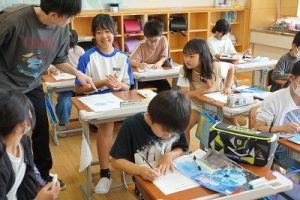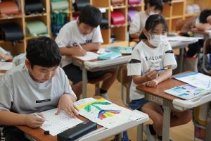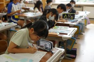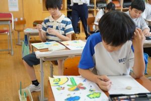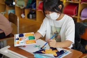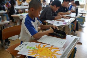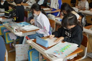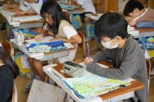 4年生が図画工作科の時間に製作してきた「まぼろしの花」が完成に近づきました。描きがった人から作品の説計を書いていました。落ち着いた雰囲気で作業が進められています。