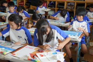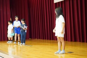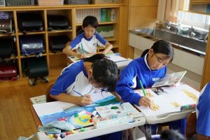 2校時の様子です。2年生は、畑の草むしりをしました。教室に戻ろうとしたとき、大きなカマキリを発見して大騒ぎでした。4年生は、学習発表会の練習をステージで行っていました。5年生は、「1枚の写真から」想像を広げた絵が完成に近づいていました。