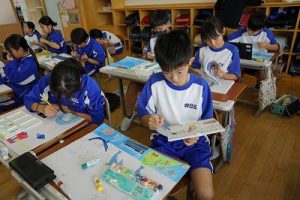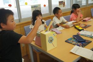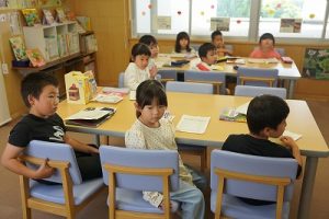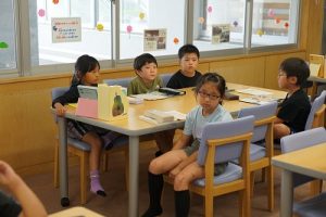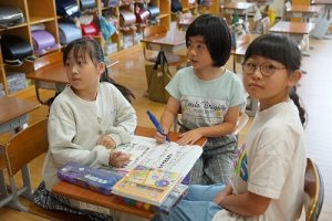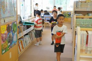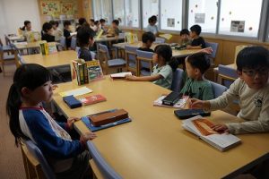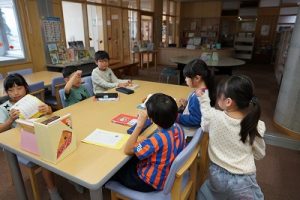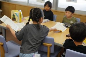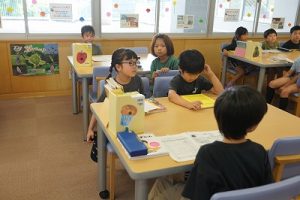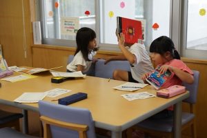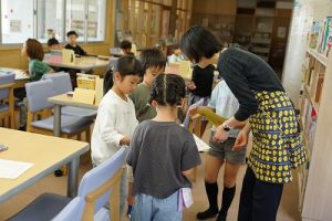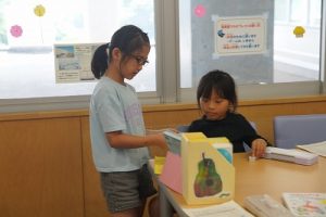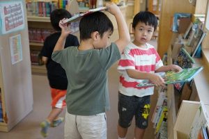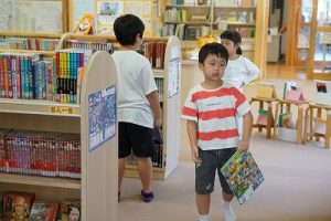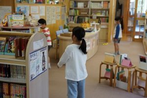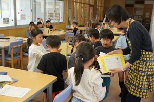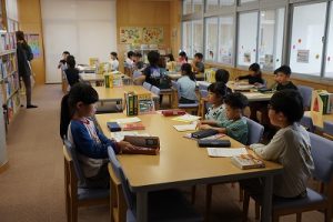 1年生は、図書室で、本を借りたり、読みたい本を読んだりしていました。貸し出しカードを進んで配ってくれたり、静かに待っていたりと、とてもよい態度です。素晴らしいです。