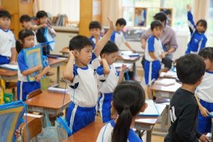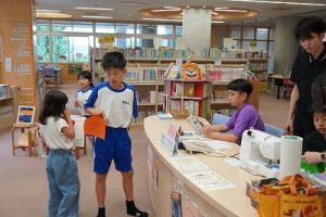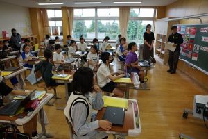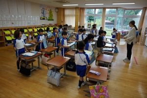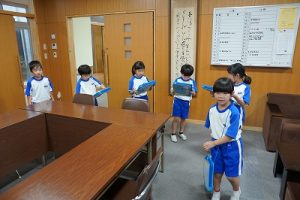 1年生の生活科では、学校探検でいろいろな先生にインタビューを行いました。校長室にも6名の子どもたちが来てくれました。