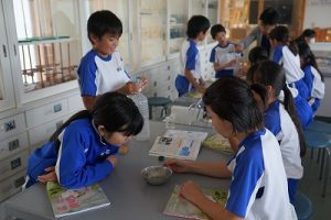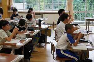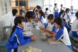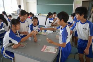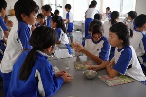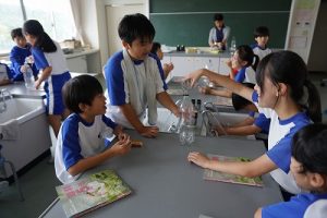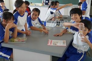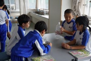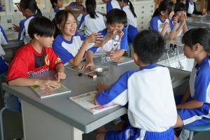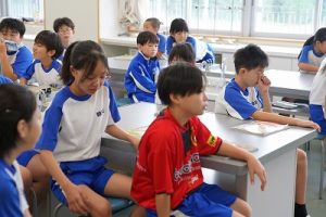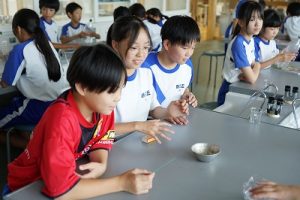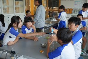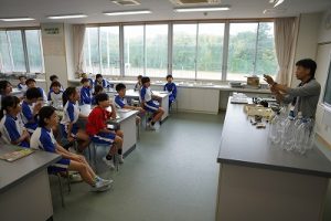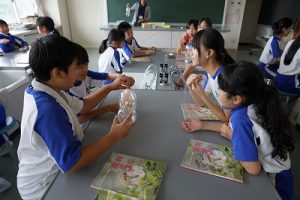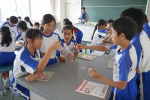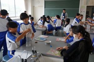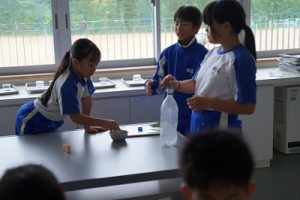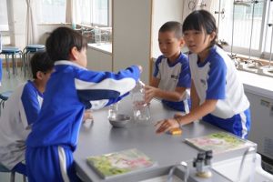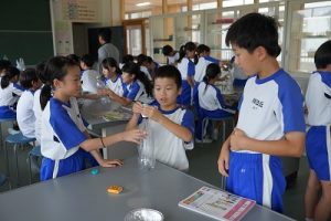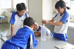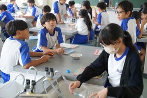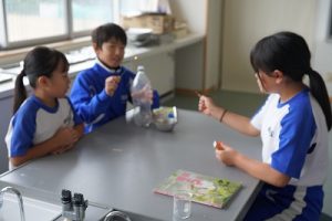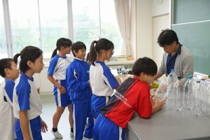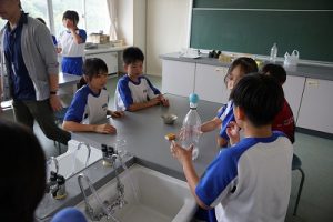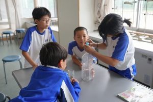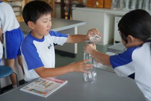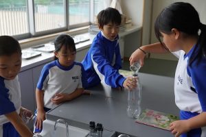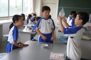 5年生の理科では、ペットボトルの中に「雲」を作る実験をしていました。線香の煙の粒を「核」として、気圧の変化によって雲を作る実験です。このような体験をすることで、実感を伴った理解に繋がります。