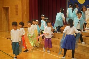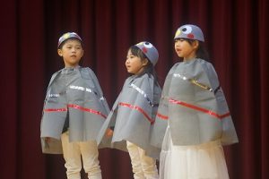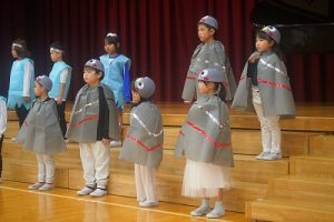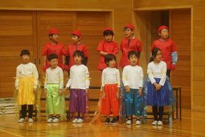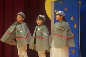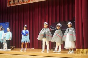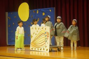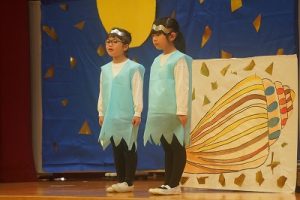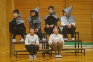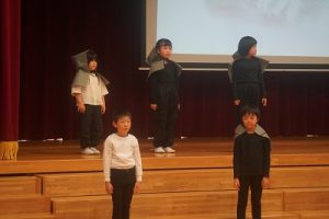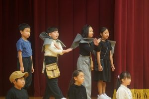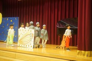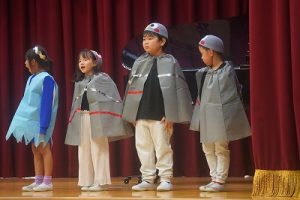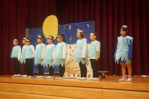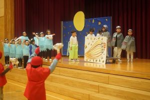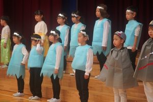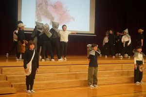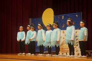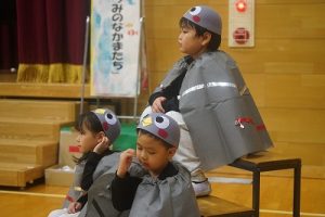 つばめの兄弟と海の仲間たちの、優しく、ほっこりするおはなしです。嵐に遭い、家に帰れなくなったつばめの兄弟。海の仲間たちは、つばめたちを助けようと、みんなで相談をし始めます。1年生26人がお届けする、かわいらしく、一生懸命な演技をご覧ください。劇の最後に、「幸せなら手をたたこう」という曲を歌います。ぜひ、一緒に手をたたいて楽しんでください。