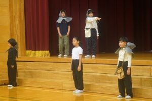 「かげおくり」という遊びを知っていますか。「かげおくり」を楽しんでいた「ちいちゃん」たちですが、だんだん、できなくなってしまいました。国語科で学習した「ちいちゃんのかげおくり」の物語を、場面の様子や登場人物の心の動きが分かるように演じます。じっくりとご覧ください。