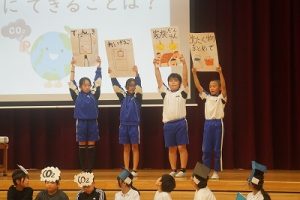 4年生は、総合的な学習の時間にSDGsについて調べたり、活動したりしています。その中で、地球温暖化について学び、今、地球に大変なことが起きていることを知りました。地球に何が起きているのか、私たちに何ができるのかを、この学習発表会で全校児童に伝え、みんなで環境問題に取り組んでいきたいと思います。どうぞ、ご覧ください。