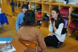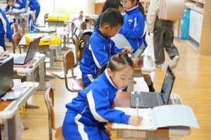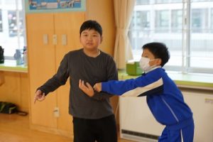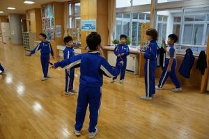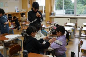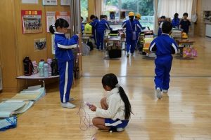 1年生の算数科では、「9+6」を体験していました。9人と6人が合体して10人を作り、残った人の人数が1の位の数字となるというわけです。体験しながら学習していて面白いですね。