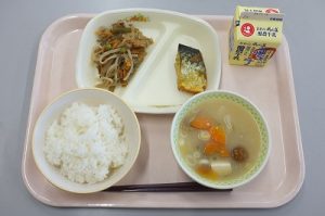 ・ご飯 ・牛乳 ・サバのカレー焼き ・茎ワカメのきんぴら ・なめこ汁