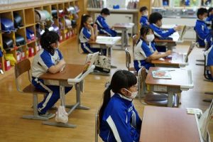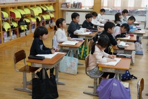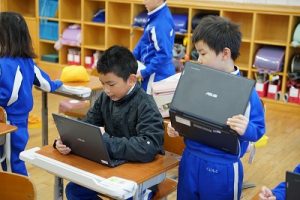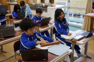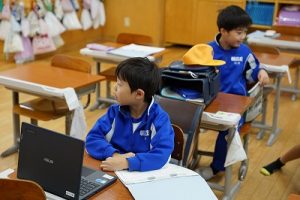 8時ごろの様子です。雨の中を登校してきたばかりですが、もう元気いっぱい遊んでいます。2年生は、学校に来た人からタブレットPCを見ながら連絡帳を書いています。運営委員会では、毎朝、校内放送を行っています。