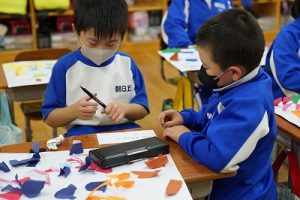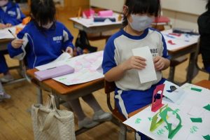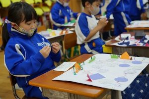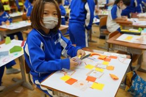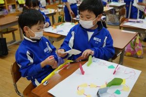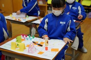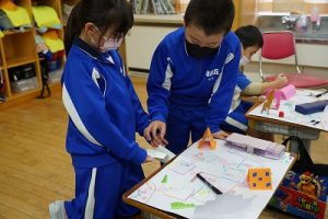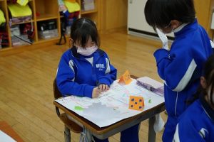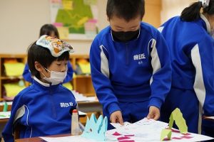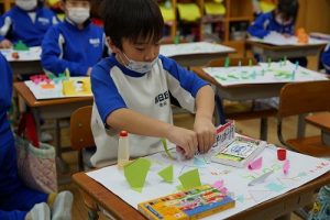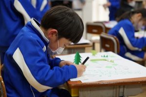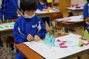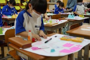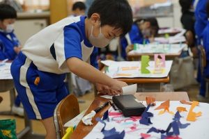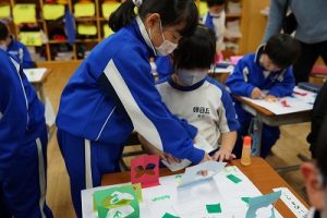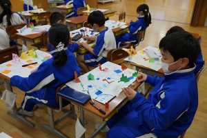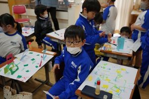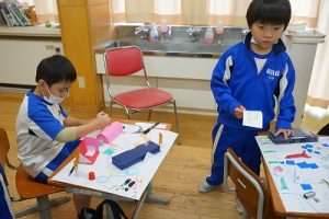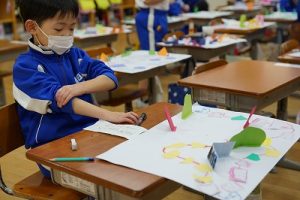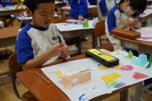 1年生の図画工作科では、すごろく作りをしていました。完成した作品には、タイトルを付けていました。友達に教えてあげるやさしい姿もたくさん見られました。