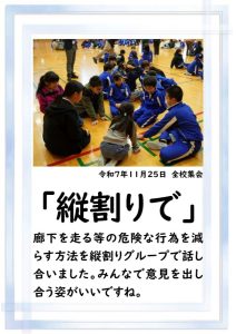 【生徒指導】学校内で安全に過ごすために、「廊下を走る」「階段の手すりを滑る」ということについて、「なぜそのようなことをしてしまうのか」「危険な行為を減らすにはどうしたらよいか」について、グループごとに話し合いました。安全に過ごせるように、お互いに気を付けていきましょう。