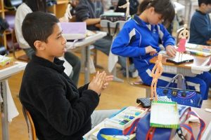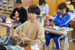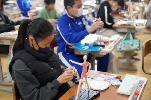 6年生の図画工作科では、紙粘土を使って人物モデルを製作しています。今日は、芯に取り付けた紙粘土に色を付けていました。だんだんと出来上がってきています。